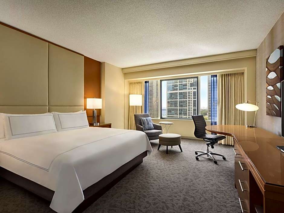 This room is located on the 20th floor or higher.and features views of the Chicago skyline. It offers a private bathroom with a spacious shower and bath tub, along with upscale bath amenities.