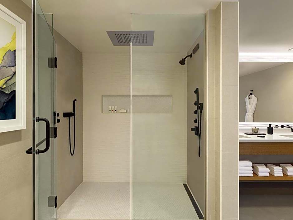 This room is located on the 20th floor or higher.and features views of the Chicago skyline. It offers a private bathroom with a spacious shower and bath tub, along with upscale bath amenities.
